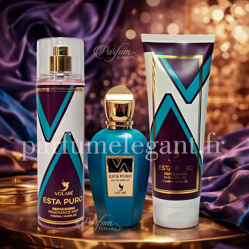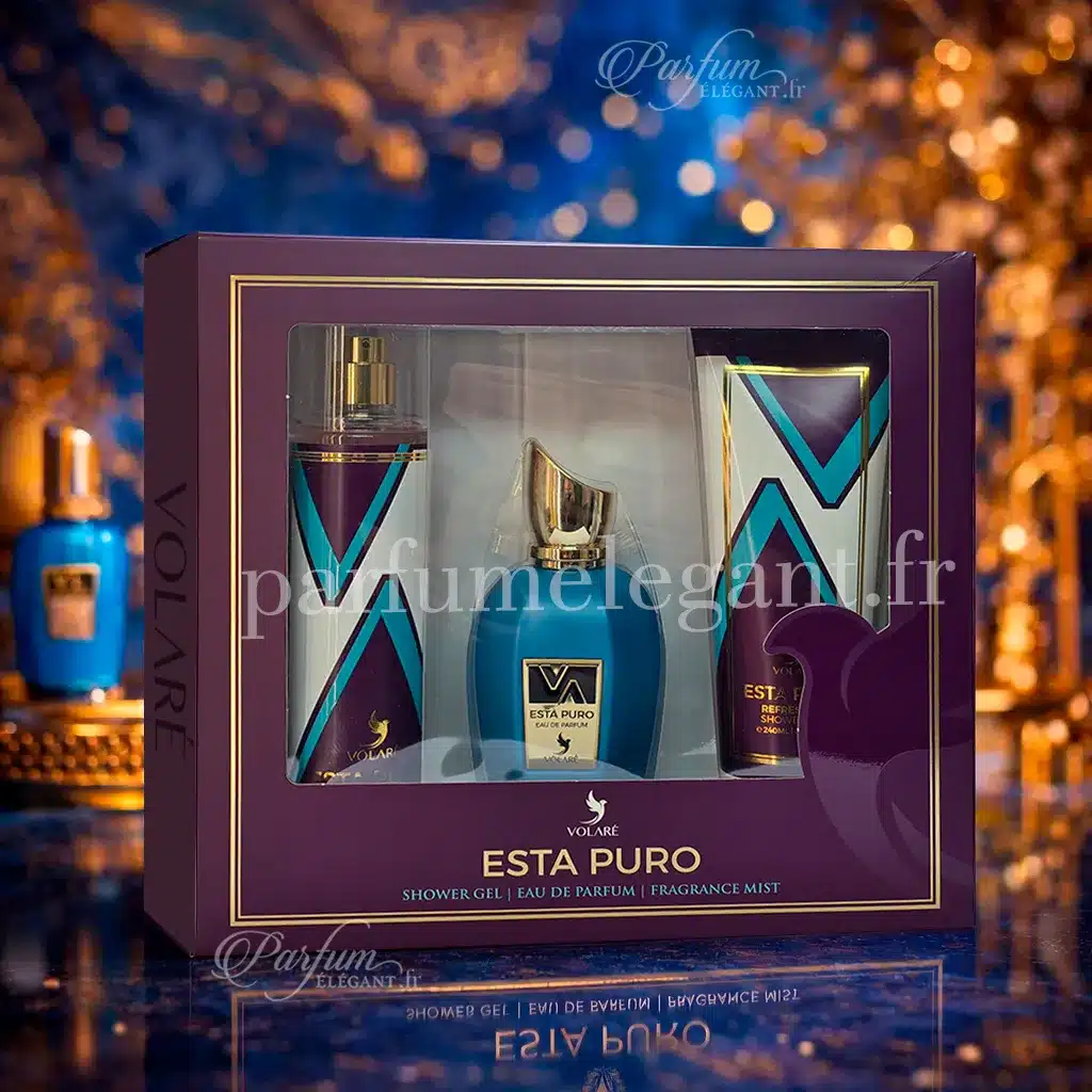 Le coffret Esta Puro réunit le parfum 100ml, la brume parfumée 250ml et le gel douche 240ml pour une expérience complète fruitée, musquée et vanillée. Une fragrance lumineuse et élégante, parfaite pour offrir ou se faire plaisir.