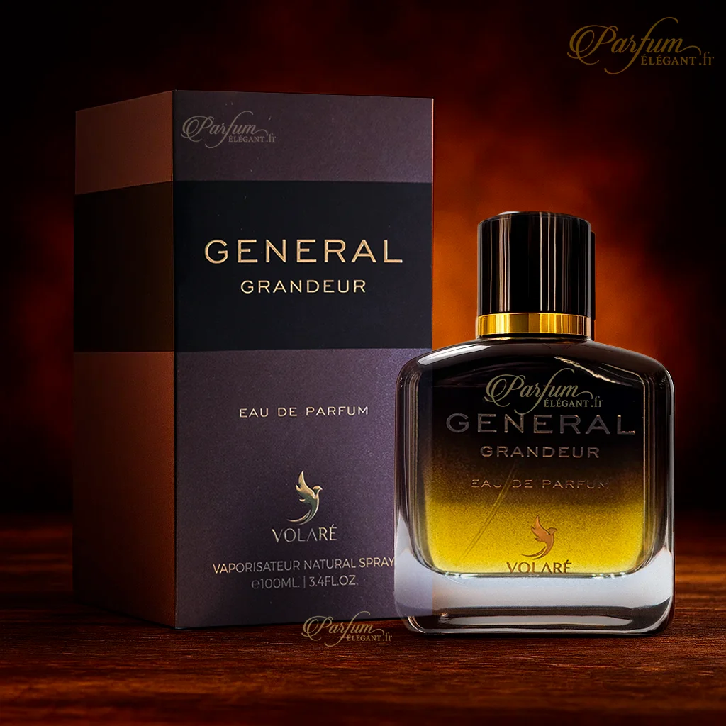 Plongez dans l’univers raffiné de General Grandeur Volaré, un parfum oriental boisé ambré pour homme qui marie fraîcheur, chaleur et sophistication. Un parfum moderne et charismatique, pensé pour l’homme élégant et sûr de lui.