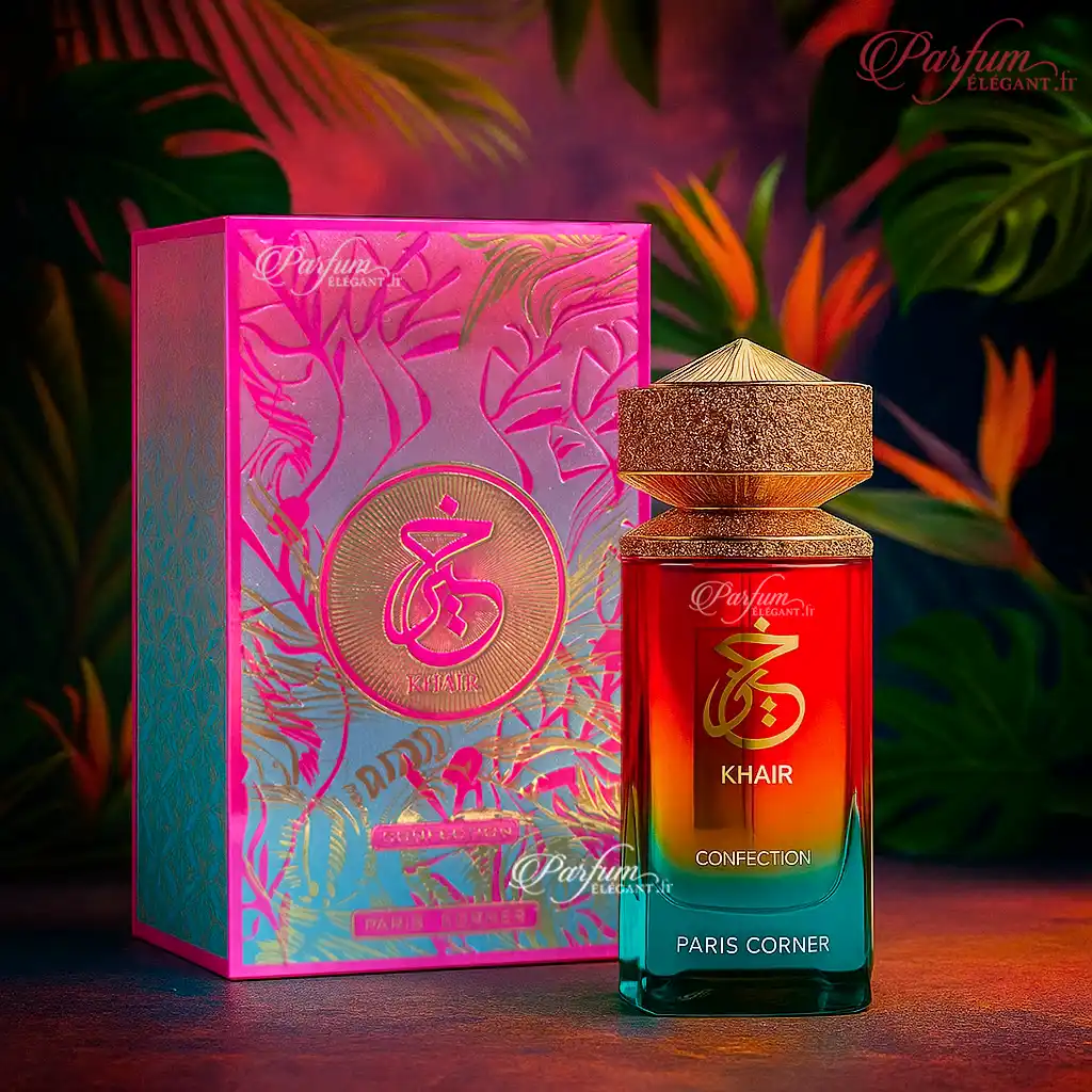 Khair Confection est une fragrance raffinée qui célèbre la gourmandise et la féminité à travers des accords fruités, crémeux et boisés. Parfait pour celles qui aiment les parfums doux et enveloppants.