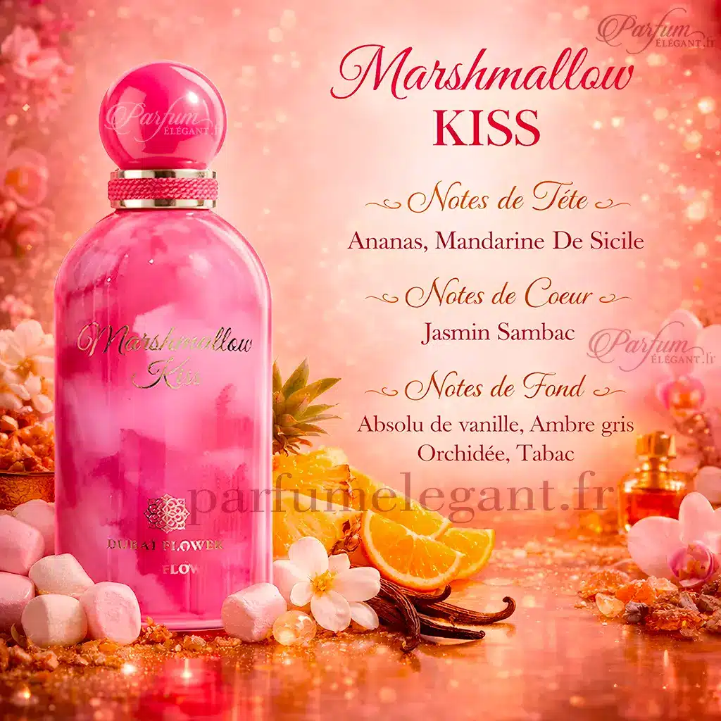 Marshmallow Kiss de Dubai Flower est une eau de parfum féminine fruitée et gourmande mêlant ananas juteux, jasmin lumineux, vanille chaude et ambre gris pour un sillage sensuel et captivant.