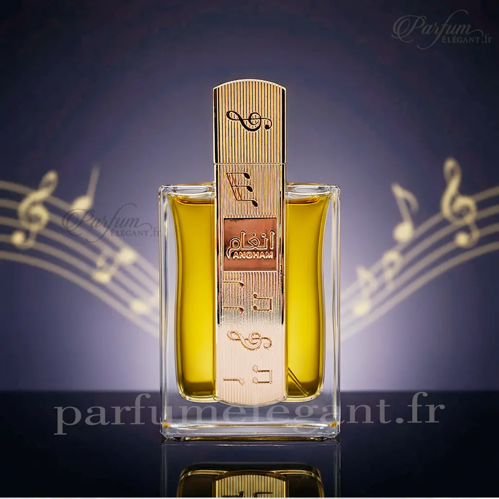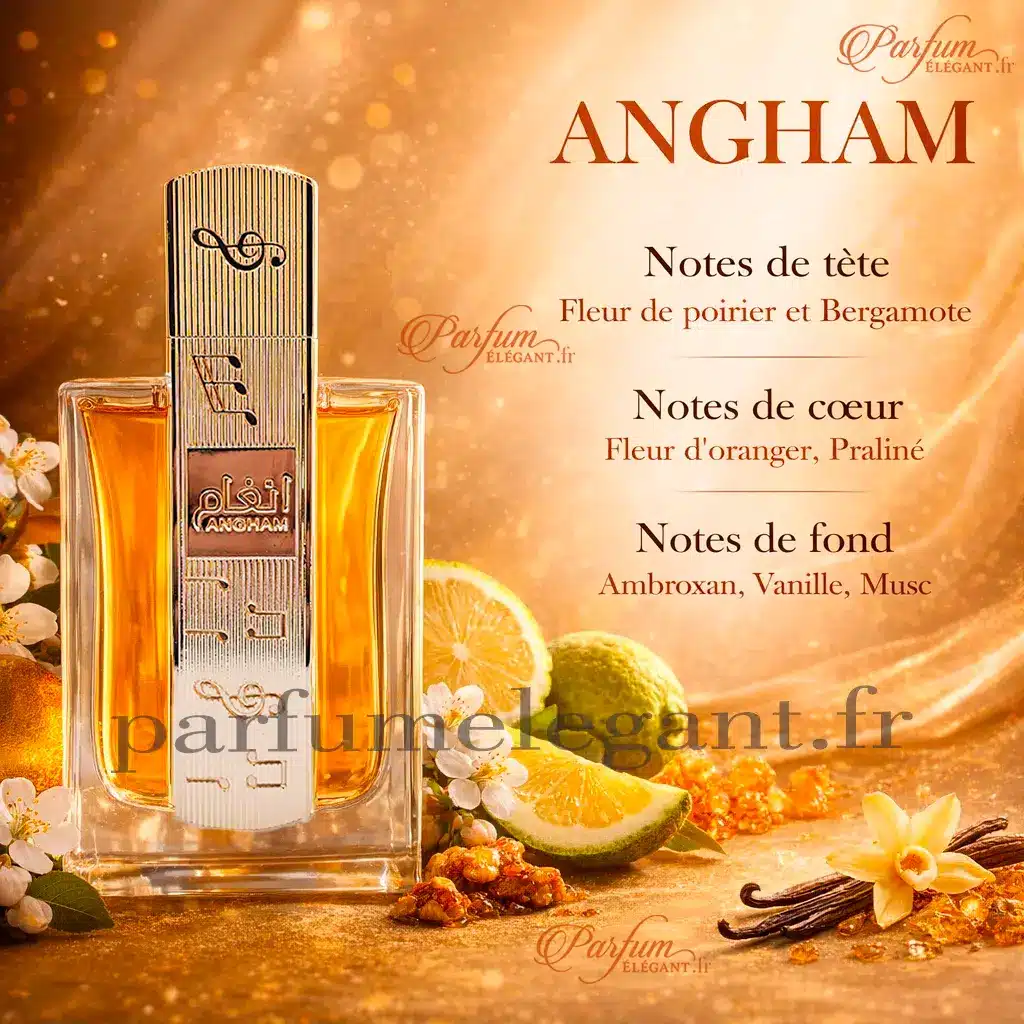 Angham de Lattafa est un parfum oriental vanillé mixte lancé en 2024. Il associe gingembre, praliné, cacao, vanille et ambre pour un sillage moderne et élégant.